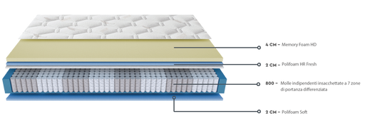 Oltre ai tradizionali materassi a molle, anche materassi con moderne tecnologie a molle indipendenti, micromolle e materassi ergonomici in schiume evolute, frutto della tradizione artigianale unita a una costante ricerca.